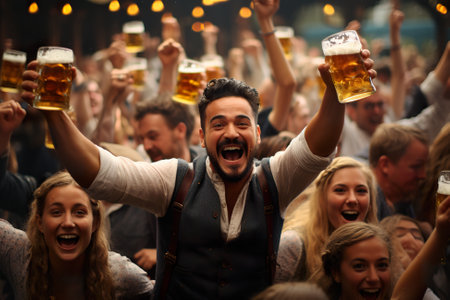 A group of people holding up beer glasses. Generative AI. People celebrating Oktoberfest, beer festival.