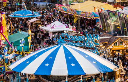 Munich, Germany - October 7: people and fairground rides at the biggest folk festival in the world - the oktoberfest on oktober 7, 2018 in munich.