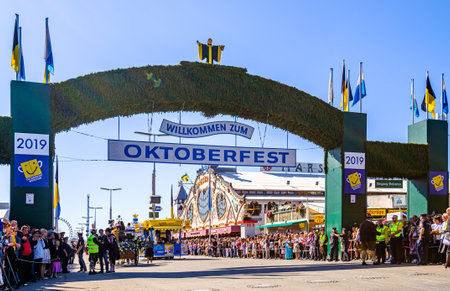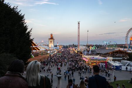Munich, Germany - September 28: visitors, beertents and fairground rides on the oktoberfest in munich at September 28, 2019