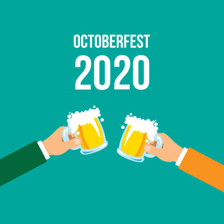 Oktoberfest 2020 banner. Cheers mugs of beer. Autumn holidays. Isolated vector Illustration. Design for web page, invitations, flyers.