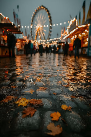 Autumn leaves scatter over wet cobblestones, reflecting colorful lights as a blurred ferris wheel spins in the background. the festive evening carnival atmosphere contrasts with the quiet foreground, capturing a mix of serenity and excitement. Generative AI