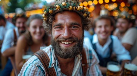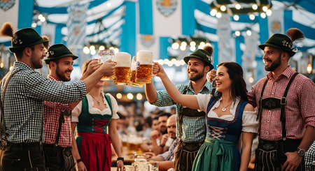 Joyful friends in traditional Bavarian attire toasting beer at Oktoberfest.