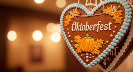 Gingerbread heart with Oktoberfest text and pumpkin decoration. A festive sweet treat and holiday celebration concept.