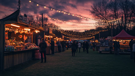 As the sun sets, a local Easter fair comes alive with colorful stalls, festive decorations, and string lights creating a warm, inviting atmosphere for visitors enjoying the event.