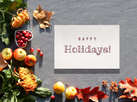 Autumn decorations, top view with text Happy Holidays on paper. Orange chrysanthemum flowers, dry satsuma and red oak leaves.