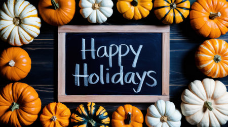 Festive Pumpkins Surrounding Chalkboard with Happy Holidays Message on Dark Wooden Background.