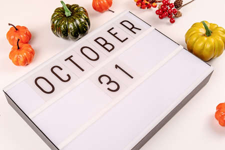 Happy halloween concept. October 31 light box on white table with pumpkins scattered around