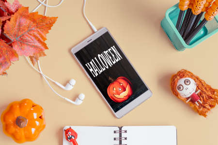 Flat lay Happy Halloween Mobile phone mockup background concept. Top view of smartphone on office desk table with Halloween accessories. Flat lay design.