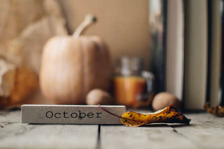 The month of October is written in wooden letters. The calendar. Fall. Dry leaves on a yellow background.