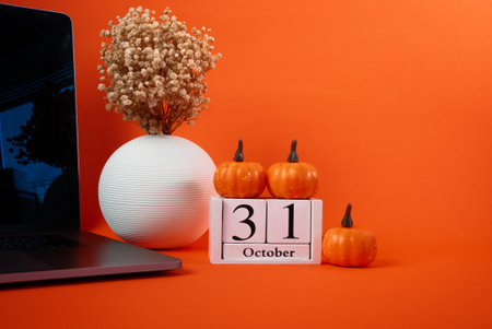 Minimalistic Halloween setup with pumpkins, flowers, and calendar October 31 on bright orange background. Perfect for seasonal design and marketing.