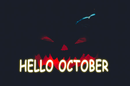 Lettering hello october. Halloween pumpkin on black background. holiday autumn intimidating