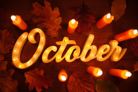 October letters with yellow and red leaves and fall fruits. Minimal flat lay creative concept. Autumn composition. Dried leaves on background. Month
