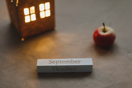 Wooden blocks against a rustic wood background with pumpkins and autumn leaves. Background with candle and pumpkin. Autumn background. Autumn months.
