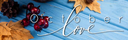 panoramic concept of autumnal leaves, berries, acorns and cones near october love lettering on blue wooden background