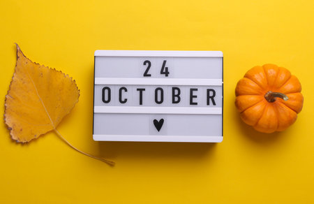 24 October letterboard text on LED Lightbox with autumn fallen leaf and pumpkin, yellow background. Seasonal calendar. Flat lay. Top view