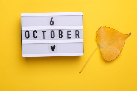 6 October letterboard text on LED Lightbox with autumn fallen leaves, yellow background. Seasonal calendar. Flat lay. Top view