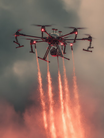 A drone equipped with firefighting equipment releases fire retardant over a blazing wildfire in a forest, working to control the flames during summer.