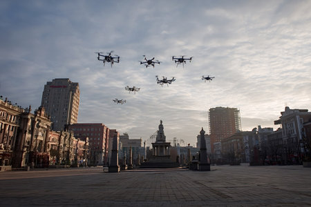 Squadron of modern autonomous surveillance drones with cameras flying over an empty urban city square, representing future smart city monitoring and advanced security technology concepts