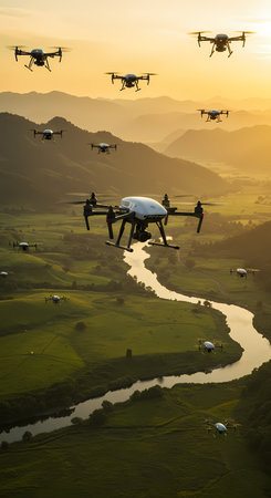 A stunning aerial view of drones flying over an industrial cityscape during sunset. Highlighted by a warm glow, the scene captures the intersection of technology and urban life.