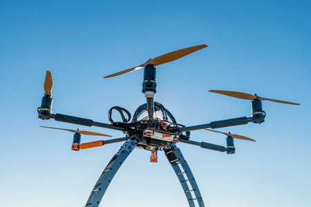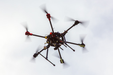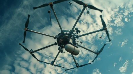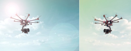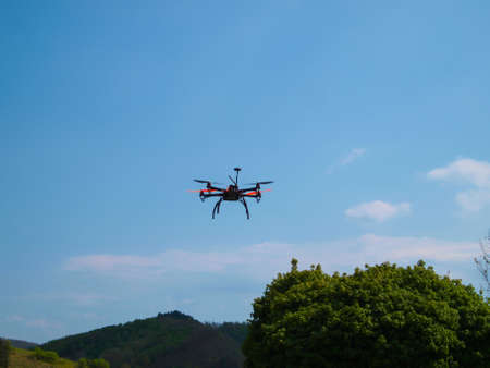 Black drone in the sky. Bright picture of quadcopter flying and making photos and video from high.