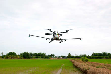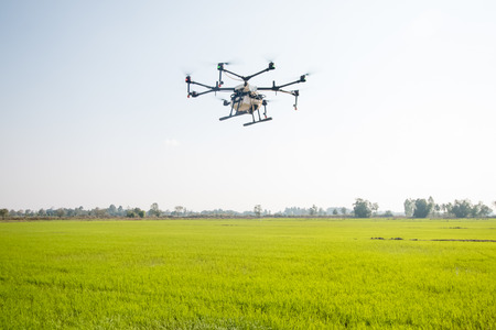 Big agriculture drone flying over the rice field to sprayed chemical or fertilizer.