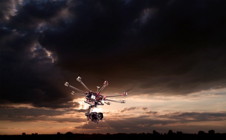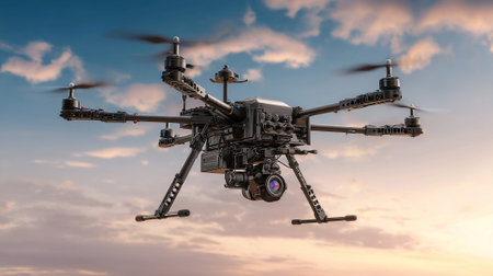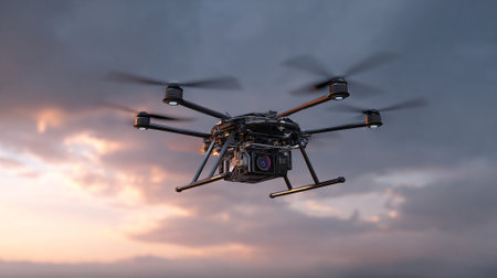 A high-tech drone hovers mid-air against a backdrop of swirling, dramatic sky illuminated with the soft glow of sunset. The drone's advanced features and propellers are sharply focused.