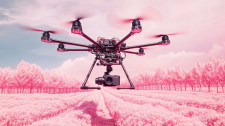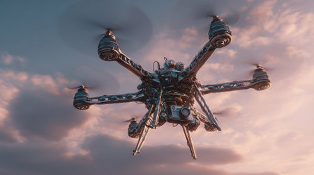 This striking image captures a sophisticated, multi-rotor drone in flight, its advanced mechanics displayed against the backdrop of a pastel pink and blue sky at dusk. The drone's features are sharply rendered.