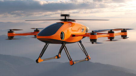 An eye-level perspective of an orange drone, gracefully suspended against a background of muted hills and sky. Its sleek design and multi-rotor setup offer a compelling view of autonomous technology.