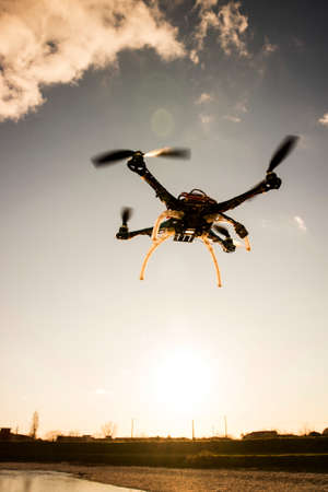 Drone on a background of a beautiful sunset. UAV in flight. Quadrocopters on radio.