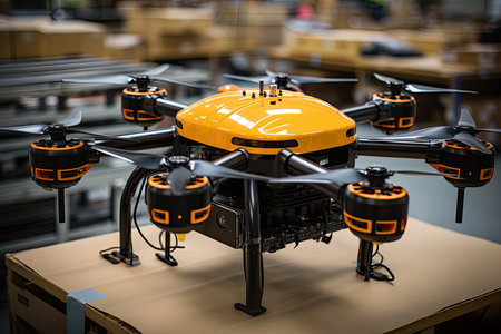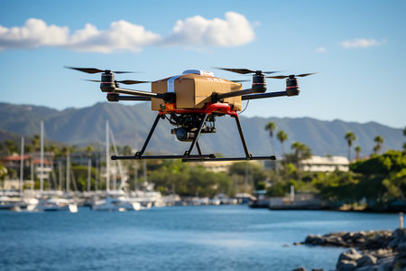 A drone delivers food, drinks or medicine in a cardboard box to customers on a yacht. horizontal photo