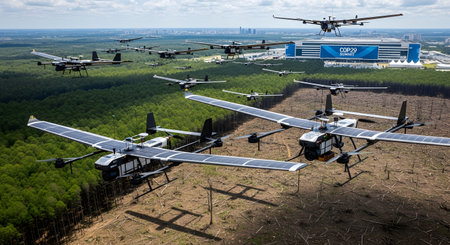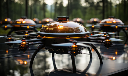 Fleet drones fly over forest. Solar power aerial vehicles gather data, monitor conservation with innovation. Solution for sustainability, COP29 Summit event.