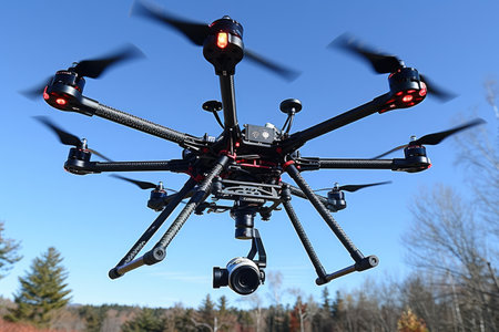 An advanced drone, with a detailed camera and structure, poised against a blue sky. Its metallic components reflect the ambient light, showcasing its technology and capabilities in flight.