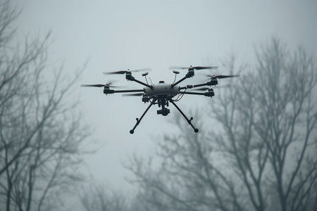 A modern drone is captured mid-flight against a picturesque sky, showcasing its sleek design and advanced capabilities. The blurred propellers emphasize its movement while the clear camera lens hints at its surveying purpose.