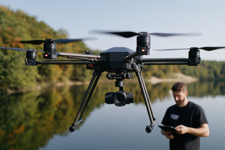 A drone pilot controls a flying device near a calm lake surrounded by colorful autumn trees.