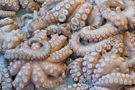 Close-up of fresh octopus tentacles on the counter of an Italian fish market