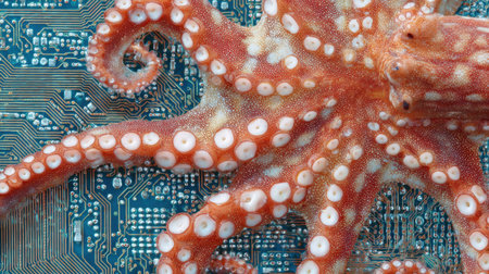 Close-up of an octopus displaying unique skin patterns that mimic the design of a digital circuit board against a tech background.