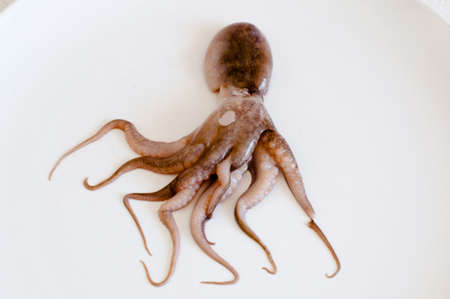 Top view of raw octopus isolated on a plain white background, focusing on natural form and slimy surface details