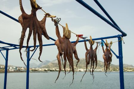 Octopuses are dried in the sun in the Mediterranean fishing village