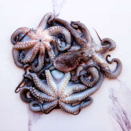 Whole raw octopus on a white stone table. Concept- healthy food, fresh seafood. Selective focus.