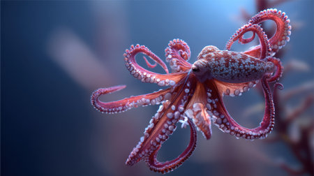 Vivid red octopus against deep blue ocean, high detail, macro shot, natural lighting