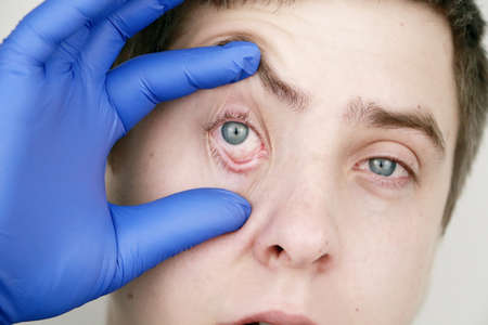 A man is examined by an ophthalmologist. A terrible sight of the eye with redness and tearing