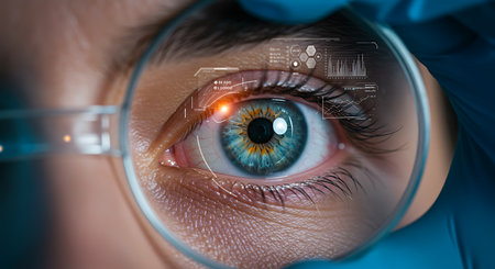 A skilled surgeon engages in intricate microsurgery on a patient's eye, utilizing high-tech tools and magnification for vision correction.