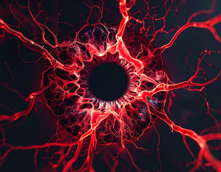 From a dark, central void, a network of vibrant red energy erupts, spreading like a cosmic infection or a supercharged neural network. This abstract visual captures concepts of intense power, rapid growth, and the beautiful yet terrifying nature of biological and cosmic systems.