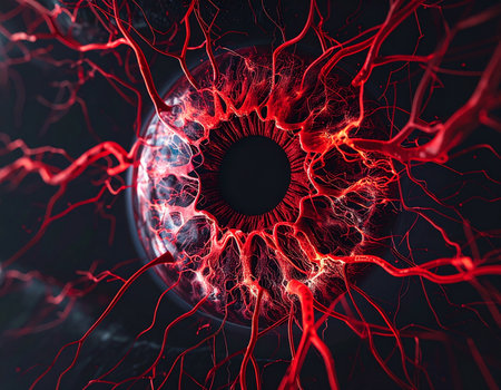 Captivating image of a glowing cell showcasing intricate red patterns and vibrant electromagnetic effects. Perfect for science and technology themes.