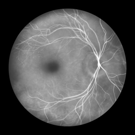 Retina with microaneurysms, illustration in black-and-white fluorescein angiography style showing focal hyperfluorescent microaneurysms typical of diabetic and hypertensive retinopathy.
