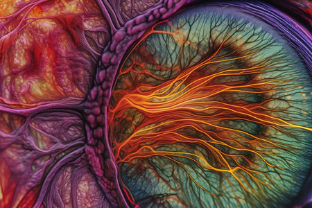 Close up focus reveals detailed structures of a human eye, highlighting vibrant colors and unique patterns present in the iris and veins.