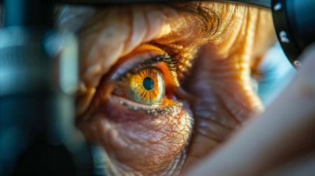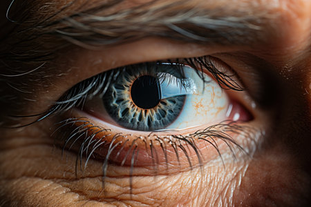 close up view of mature human eye looking at camera, panoramic shot