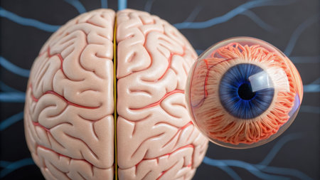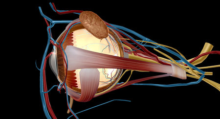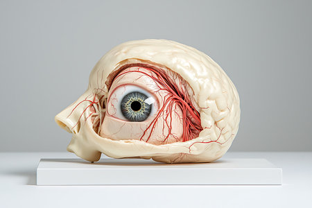 This detailed anatomical model offers a vivid representation of the human eye structure, showcasing muscles, blood vessels, and nerves in a cross-section view.