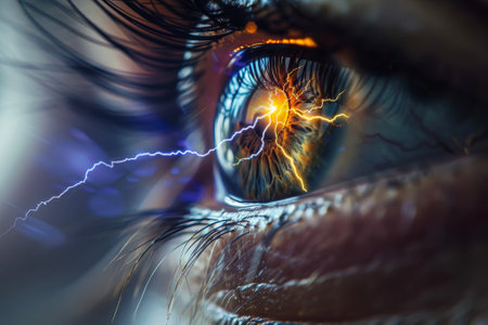 A close-up of a human eye with lightning reflected in the pupil