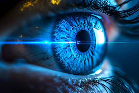 A futuristic close-up of a human eye with a glowing blue digital interface, symbolizing biometric scanning, artificial intelligence